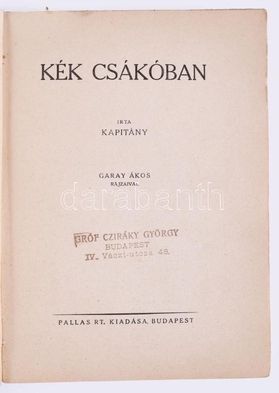 Kék csákóban. Írta: Kapitány. Garay Ákos rajzaival. Bp., Pallas. Kiadó... https://www.darabanth.com/hu/514-Filatelia-kepeslap-numizmatika-mutargy-konyv-papirregiseg-ekszer-aukcio/515.0/Konyvek/Konyvek-Egyeb-ritkasagok~633/Kek-csakoban-Irta-Kapitany-Garay-Akos-rajzaival-Bp-Pallas-Kiadoi-papirkotes-gerinc~II3460129