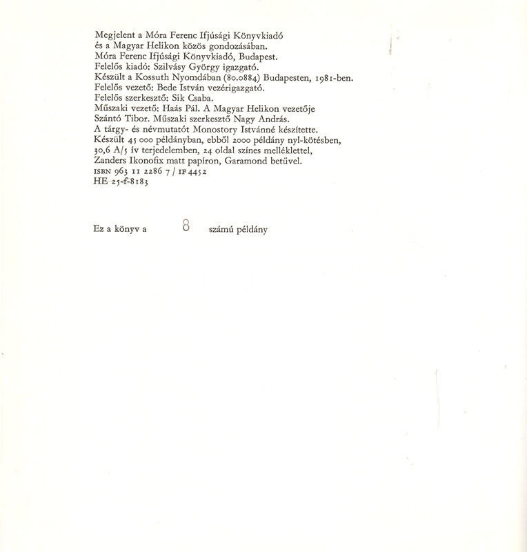 Könyvgyűjtők számára készült, számozott, bibliofil kiadás. Kolofon: "A Magyar Helikon vezetője Szántó Tibor. Műszaki vezető: Haás Pál. Készült 45.000 példányban, ebből 2.000 példány nyl-kötésben, 24 oldal színes melléklettel, Zander Ikonofix matt papíron, Garamond betűvel. Ez a könyv a 8. számú példány".