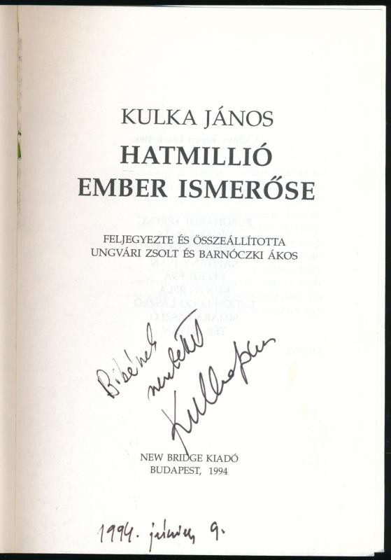 Kulka János: Hatmillió ember ismerőse. Feljegyezte és összeállította Ungvári Zsolt és Barnóczki Ákos. A művész, Kulka János (1958-) a Nemzet Színésze címmel kitüntetett, Kossuth- és Jászai Mari-díjas színművész, érdemes és kiváló művész, a Halhatatlanok Társulatának örökös tagja által DEDIKÁLT példány! Humphrey Könyvei. [Bp.], 1994., New Bridge. Kiadói papírkötés.