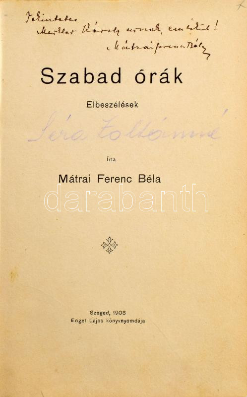 Mátrai Ferenc Béla: Szabad órák. Elbeszélések. DEDIKÁLT! Szegd, 1908, ... https://www.darabanth.com/hu/514-Filatelia-kepeslap-numizmatika-mutargy-konyv-papirregiseg-ekszer-aukcio/515.0/Konyvek/Konyvek-Egyeb-ritkasagok~633/Matrai-Ferenc-Bela-Szabad-orak-Elbeszelesek-DEDIKALT-Szegd-1908-Engel-Lajos-Kiadoi-eg~II3425767