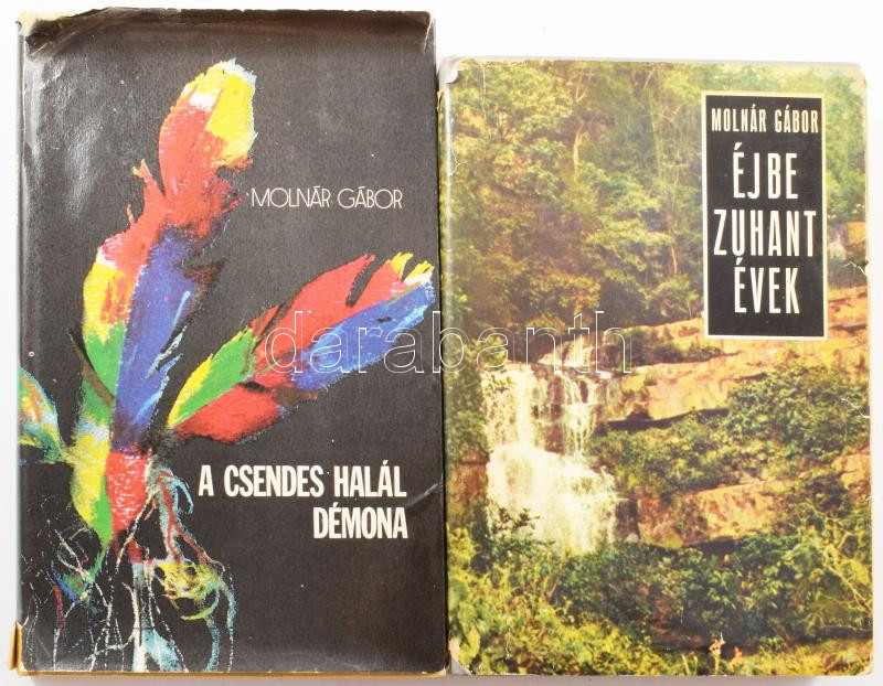 Molnár Gábor 2 dedikált kötete: Éjbe zuhant évek.; A csendes halál démona. Bp., 1973-1977, Szépirodalmi Könyvkiadó. Kiadói egészvászon-kötés / műbőr-kötés, kissé sérült kiadói papír védőborítóban. Mindkét kötet a szerző, Molnár Gábor (1908-1980) vadász- és útleírás-író, regényíró által dedikált.