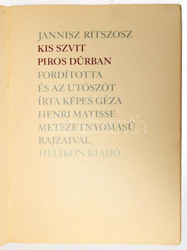 Ritszosz, Jannisz: Kis szvit piros dúrban. Fordította és az utószót írta Képes Géza. A fordító Képes Géza által DEDIKÁLT példány! Henri Matisse metszetnyomású rajzaival. (Budapest, 1984). Helikon Kiadó (Kner Nyomda, Gyoma). 1 t. (címkép) + [56] p. + 4 t. Egyetlen kiadás. Összesen 1000 példányban megjelent kötet A kötetet Szántó Tibor tervezte. Fűzve, Henri Matisse rajzával illusztrált kiadói borítóban. Jó példány.