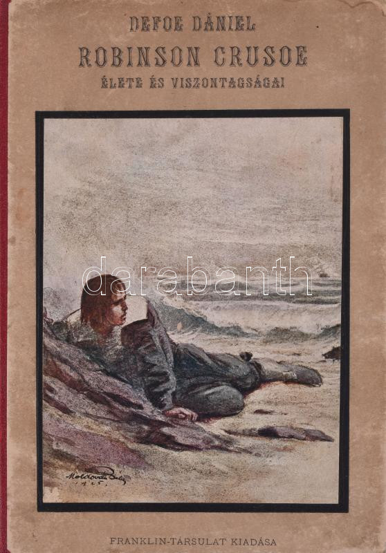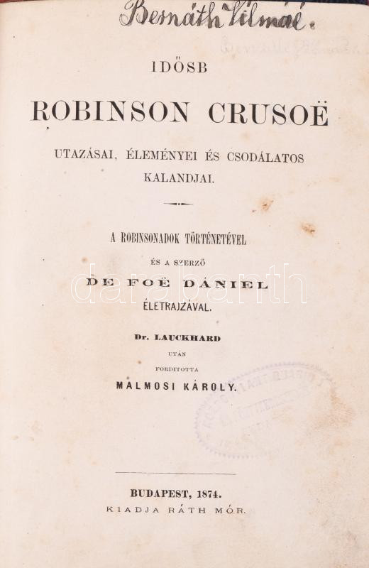 Robinson Crusoe-regények, 10 kötet: Defoe, Daniel: Idősb Robinson Crusoe utazásai, éleményei és csodálatos kalandjai.; Robinson Crusoe kalandos élettörténete. Átdolg.: Vida Aladár.; A teljes nagy Robinson. Robinson Crusoe yorki tengerész élete és csodálatos kalandjai.; Campe H. János: Robinzon. Ford.: Dávid Margit.; Robinson Crusoe élete és kalandjai. Átdolg.: Radó Antal.; stb. (Különböző kiadások, cca 1874-1945.) Változó állapotban, közte sérült.