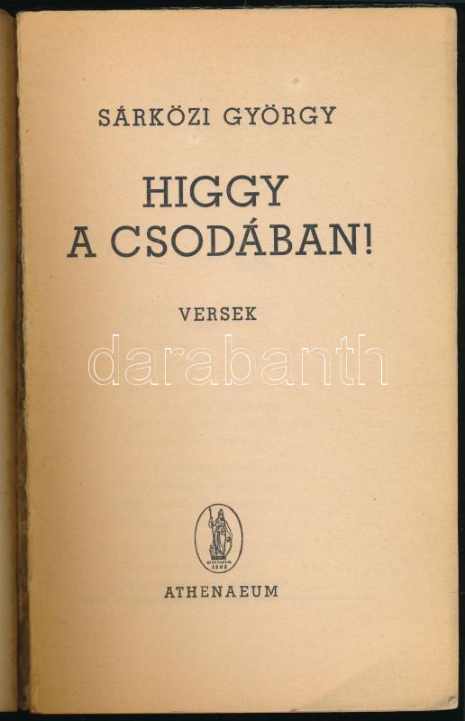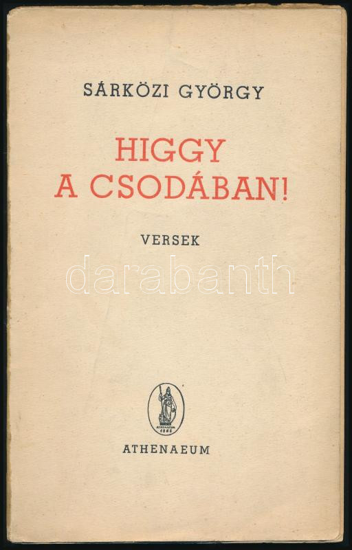 Sárközi György: Higgy a csodában! Versek. Bp., Athenaeum. Kiadói papír... https://www.darabanth.com/hu/514-Filatelia-kepeslap-numizmatika-mutargy-konyv-papirregiseg-ekszer-aukcio/515.0/Konyvek/Konyvek-Egyeb-ritkasagok~633/Sarkozi-Gyorgy-Higgy-a-csodaban-Versek-Bp-Athenaeum-Kiadoi-papirkotes-kopottas-allap~II3438974