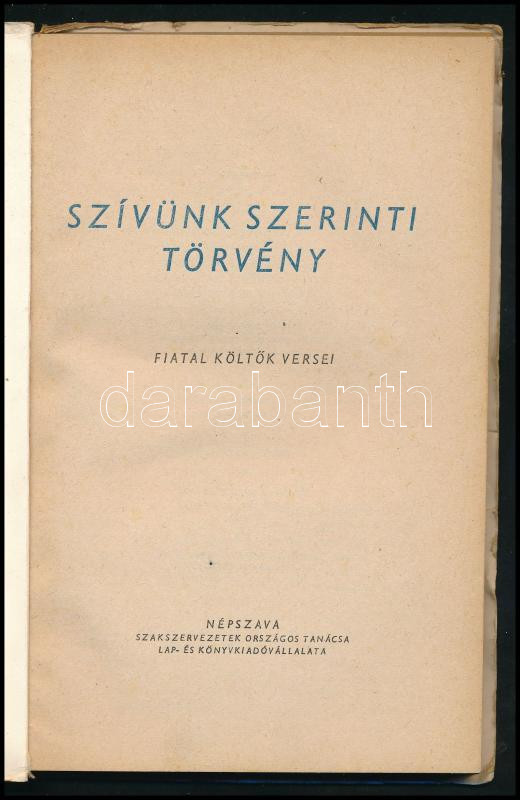 Szívünk szerinti törvény. Fiatal költők versei. Bp., 1952, Népszava. K... https://www.darabanth.com/hu/514-Filatelia-kepeslap-numizmatika-mutargy-konyv-papirregiseg-ekszer-aukcio/515.0/Konyvek/Konyvek-Egyeb-ritkasagok~633/Szivunk-szerinti-torveny-Fiatal-koltok-versei-Bp-1952-Nepszava-Kiadoi-papirkotes-k~II3425383