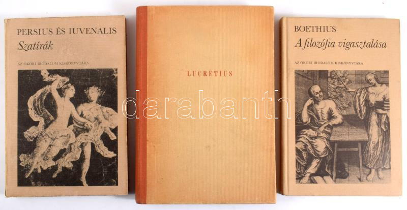 Boethius: A filozófia vigasztalása. Ford.: Hegyi György. Az utószót írta: Szepessy Tibor. Bp.,1977-1979, Európa. Kiadói kartonált papírkötések, kissé kopott borítókkal, az első gerince sérült.