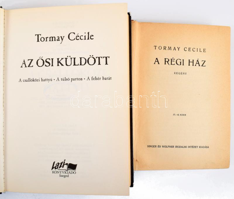 Tormay Cécile 2 kötete: A régi ház. Bp., 1939, Singer és Wolfner, 259+(1) p. Kiadói egészvászon-kötés, kissé kopott gerinccel, helyenként kissé foltos lapokkal. + Az ősi küldött. (A csallóközi hattyú. - A túlsó parton. - A fehér barát.) Szeged, 2009, Lazi, 547+(13) p. Kiadói kartonált papírkötés.