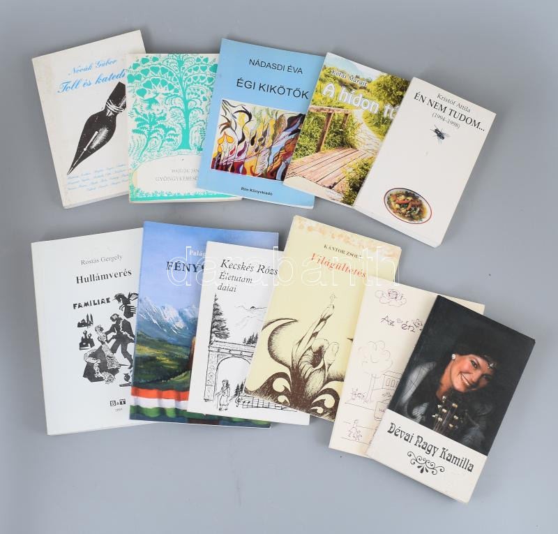 Vegyes dedikált könyv tétel, 11 db: Kristóf Attila: Én nem tudom... (1994-1998).; Nádasdi Éva: Égi kikötők.; Kántor Zsolt: Világültetés., Rostás Gergely: Hullámverés.; stb. Vegyes állapotban.