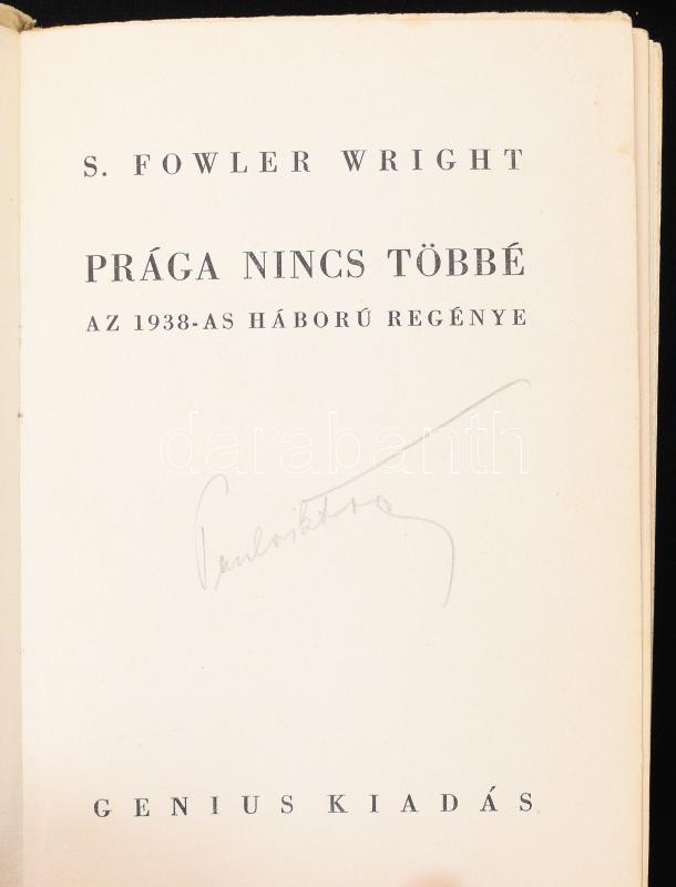 Wright, [Sydney] Fowler: Prága nincs többé. Az 1938-as háború regénye. Ford.: Ferenczy Valér. Bp., 1937, Genius, 285+(1) p. Kiadói papírkötés, kissé sérült, foltos borítóval és gerinccel.