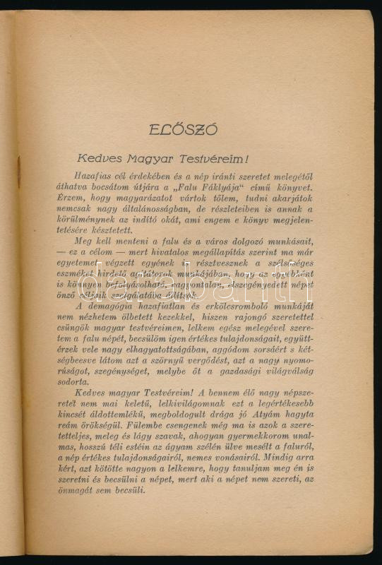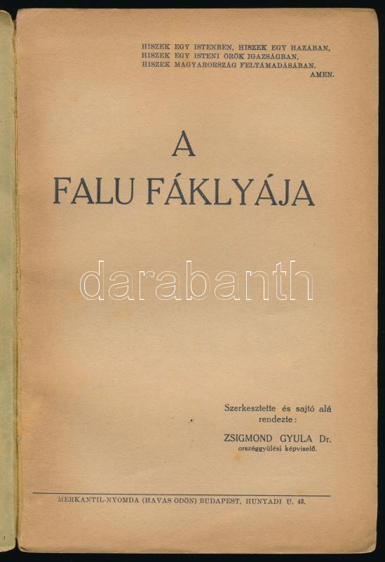Zsigmond Gyula: A falu fáklyája. Szerk. és sajtó alá rend.: - - . Bp., [1935], szerzői kiadás (Merkantil-ny.), 165+(3) p. Egyetlen kiadás. Kiadói papírkötés, kissé sérült, foltos borítóval és gerinccel. (Ritka!)