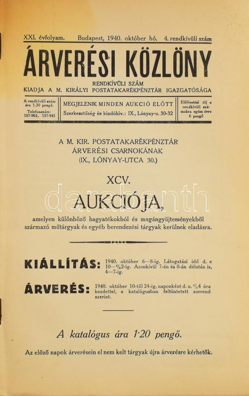 Árverési közlöny (Rendkívüli szám:M. Kir. Postat. XCV. aukciója) Bp., ... https://www.darabanth.com/hu/514-Filatelia-kepeslap-numizmatika-mutargy-konyv-papirregiseg-ekszer-aukcio/515.0/Konyvek/Konyvek-Epiteszet-muveszet~619/Arveresi-kozlony-Rendkivuli-szamM-Kir-Postat-XCV-aukcioja-Bp-1940-4-137p-XV-Kia~II3421490
