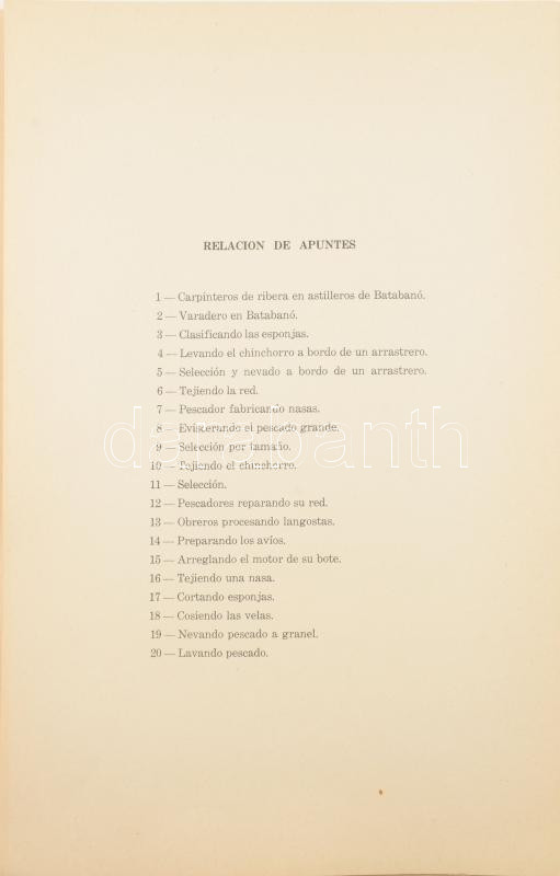 Juan Moreira: Apuntes de la Industria Pesquera. Consejo Nacional de la Pesca. 1964 - V. Aniversario de la Revolución Cubana. 1964., Empresa Consolidada de Artes Graficas, 3 sztl. lev. + 20 t. Kiadói papírmappában, sérült mappával, egy tábla sarkán kis gyűrődéssel.