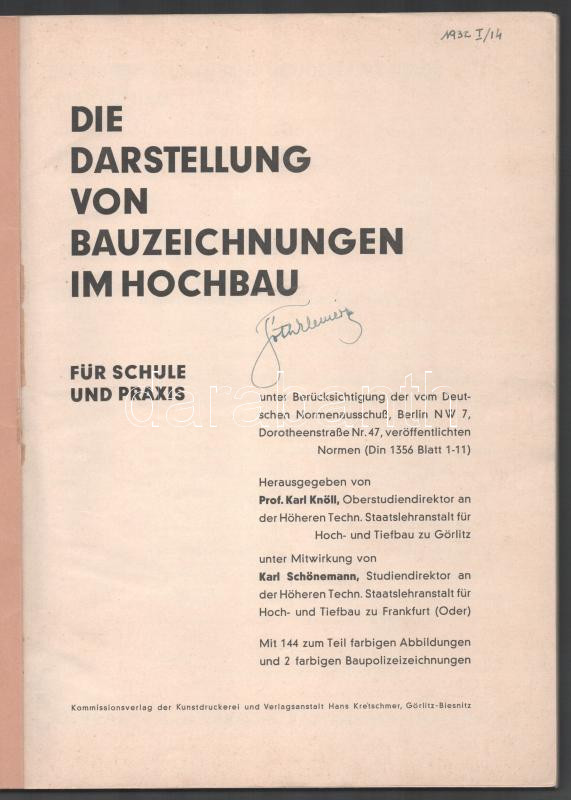 Knöll, Karl - Schönemann, Karl: Die Darstellung von Bauzeichnungen im Hochbau. Für Schule und Praxis. Görlitz-Biesnitz, é.n. [1932?], Hans Kretschmer, VIII+100 p.+ 2 (kihajtható) t. Számos szövegközti és egészoldalas ábrával illusztrálva. Német nyelven. Kiadói papírkötés, sérült gerinccel, a kihajtható mellékleteken szakadásokkal.