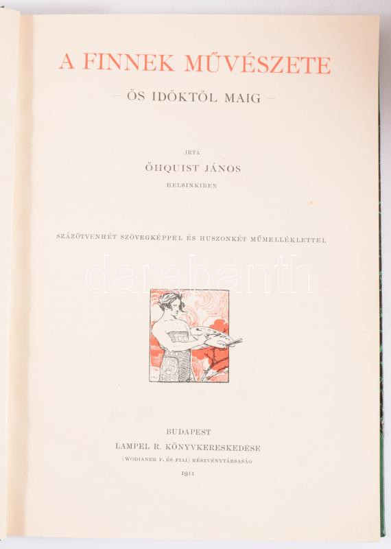 Öhquist, [Johannes] János: A finnek művészete ős időktől máig. Művészeti Könyvtár. Bp., 1911, Lampel R., 243+[1] p.+ 22 t. Szövegközi és egészoldalas, fekete-fehér képekkel illusztrálva. Átkötött, modern félműbőr-kötésben, az utolsó tábla kissé sérült, javított.