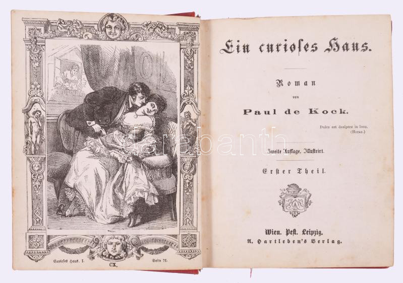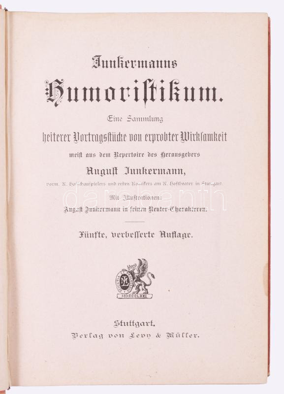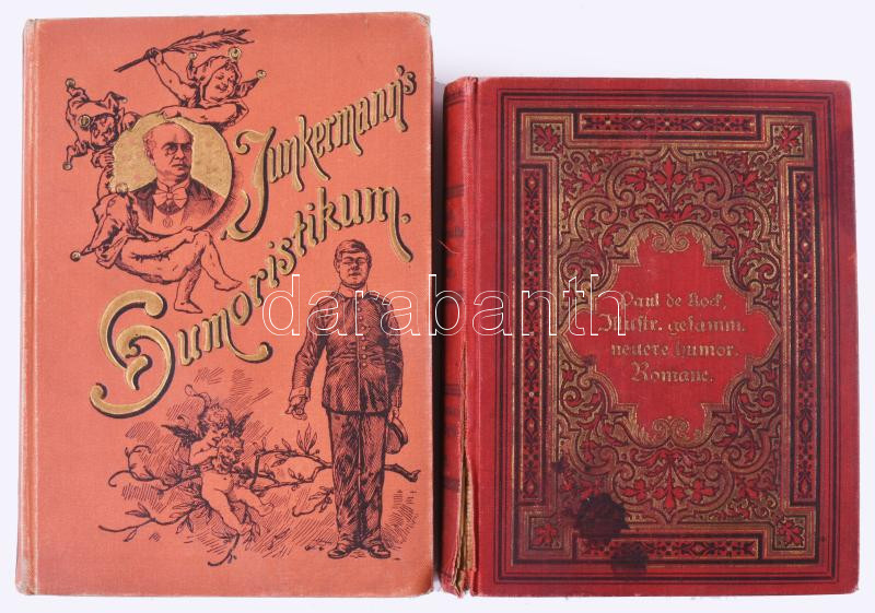 2 db német nyelvű könyv: Junkermann, August: Junkermanns Humoristikum. Eine Sammlung heiterer Vortragstücke von erprobter Wirksamkeit meist aus dem Repertoire des Herausgebers. Stuttgart, é.n., Leon & Müller. Kiadói aranyozott, illusztrált egészvászon-kötés, kissé kopott borítóval, néhány kissé foltos lappal. + Kock, Paul de: Ein curioses Haus. Roman von - - . Wien-Pest-Leipzig, é.n., A. Hartleben. Aranyozott egészvászon-kötésben, kissé foltos borítóval, sérült gerinccel, helyenként kissé foltos lapokkal.