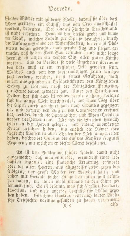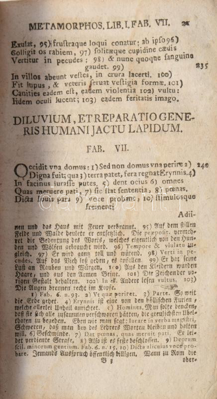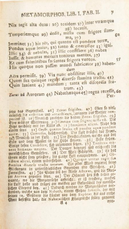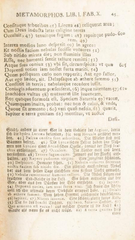 Publii Ovidii Nasonis Metamorphoseon libri XV. oder Bücher der Verwandelungen mit Deutschen Anmerkungen. Darin I) einzelne Wörter und ganze Redens-Arten erklärt, 2) die schwersten Constructiones angezeiget, 3) die Antiquitäten, Geographie und Mythologie kürtzlich erörtert werden. Nebst Lateinischen und Deutschen Registeren. Nürnberg - Wien, 1757., Johann Paull Krauß, 1 (címkép, " Silvanus. In Terminum definens", rézmetszet) t. + 688 p. + 36 sztl. lev. Latin és német nyelven. Korabeli egészbőr-kötésben, kopott borítóval, sérült és részben hiányos gerinccel, a lapok alján kisebb-nagyobb szöveget nem érintől szúette lyukakkal, kb. 639 oldaltól a végéig, az utolsó 4 lap és a két szennylap hiányzik.