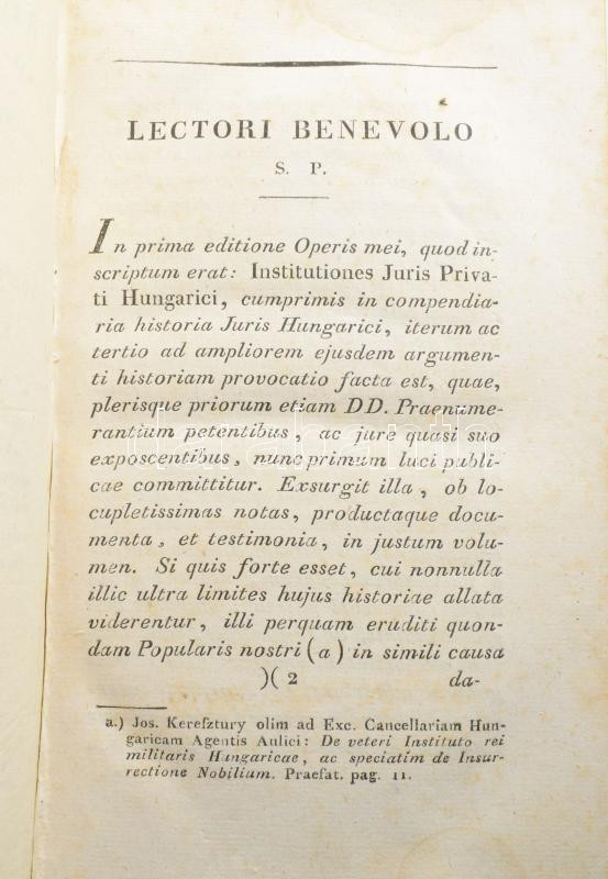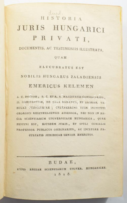Historia Juris Hungarici privati [...] Emericus Kelemen. Budae, 1818, Typis Regiae Scientiarum Unniver. Hungaricae. Hiányzó kötéstáblák, egyébként jó állapotban.