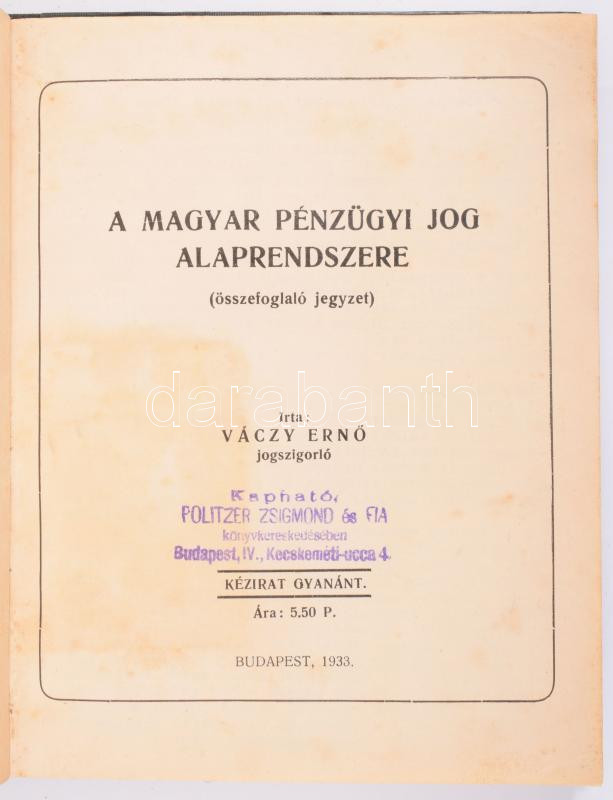 Váczy Ernő: A magyar pénzügyi jog alaprendszere (összefoglaló jegyzet.) Kézirat gyanánt. Bp., 1933, nyn., 2+III+1+114+2+26 p. Sokszorosított gépelt jegyzet. Átkötött félvászon-kötésben, aláhúzásokkal és bejelölésekkel.