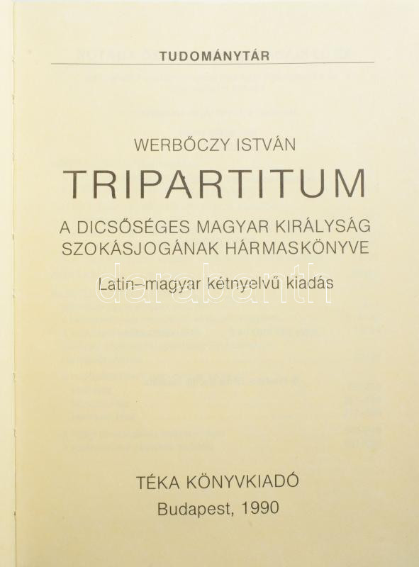 Werbőczy István: Tripartitum. A dicsőséges Magyar Királyság szokásjogának hármaskönyve. Bónis György bevezető tanulmányával. Bp., 1990, Téka, XL+2+560+2 p. Latin-magyar kétnyelvű kiadás. Megjelent 3000 példányban, ebből 500 számozott, de ez számozatlan példány. Kiadói bársonykötésű díszkiadás, foltos kiadói kartontokban.