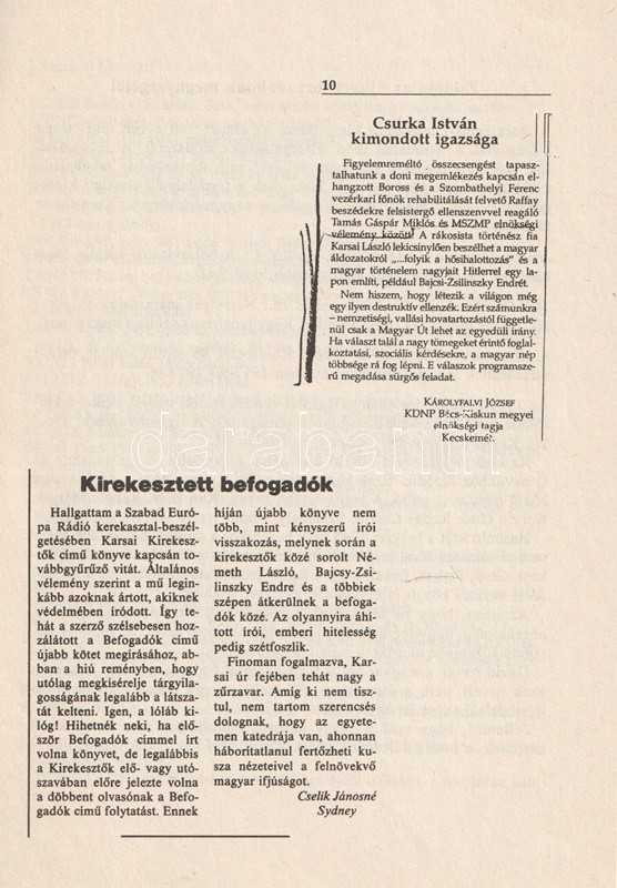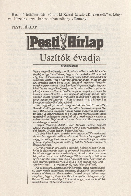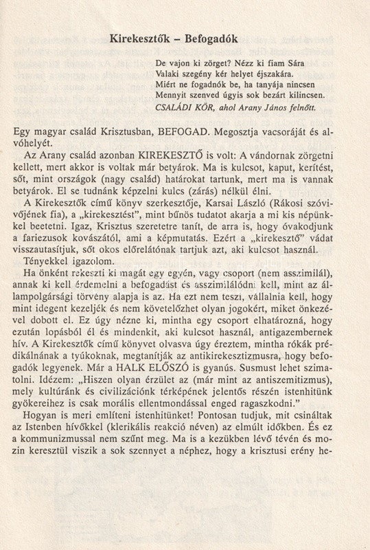 Az 1962-ben alapított, hungarista irányzatú emigráns folyóirat melléklete az 1990-es évek első felében jelentős hevességgel folyó magyarországi emlékezetpolitikai csatározások dokumentuma. Az antiszemita szemléletű kiadvány a Karsai László történész, holokausztkutató szerkesztésében megjelenő "Kirekesztők" és "Befogadók" című antológia kiadása alkalmából szemezget a kiadvány sajtóvisszhangjának dokumentumaiból (1992-1993), illetve teszi közzé sajátos, összeesküvés-elméletet súroló gondolatmenetű vitairatát a magyarországi politikum és sajtóviszonyok természetéről. Az eldurvuló, antiszemita és hungarofób kirohanásokkal teli emlékezetpolitikai vita végső soron a tudatosan távol maradó Magyar Szocialista Párt 1994-es választási győzelméhez vezetett.