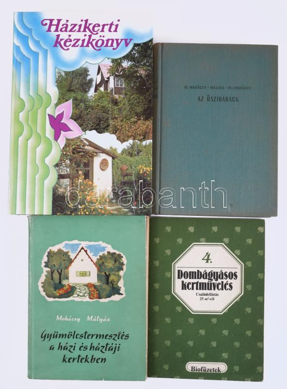 4 db kertészeti könyv: Házikerti kézikönyv.; Mohácsy Mátyás: Gyümölcstermesztés a házi- és háztáji kertekben.; Mohácsy Mátyás - Maliga Pál - ifj. Mohácsy Mátyás: Az őszibarack.; Dombágyásos kertművelés. Vegyes állapotban.