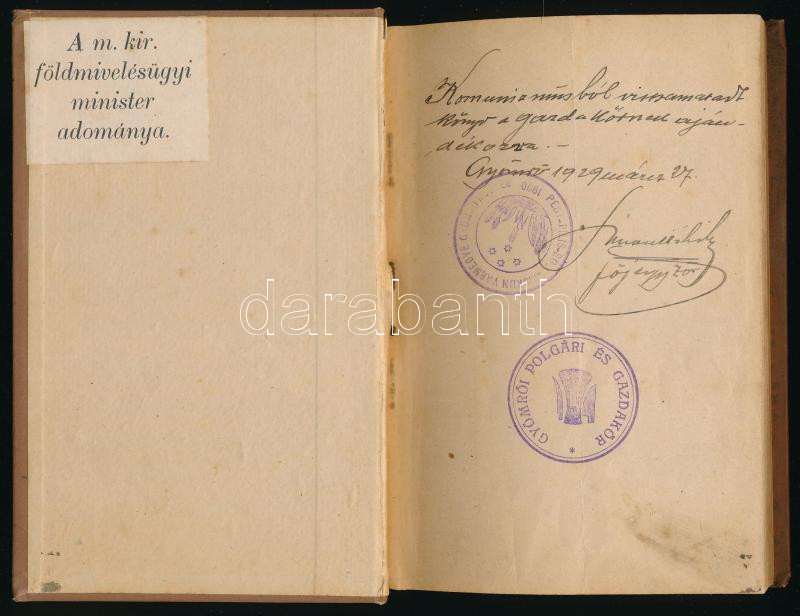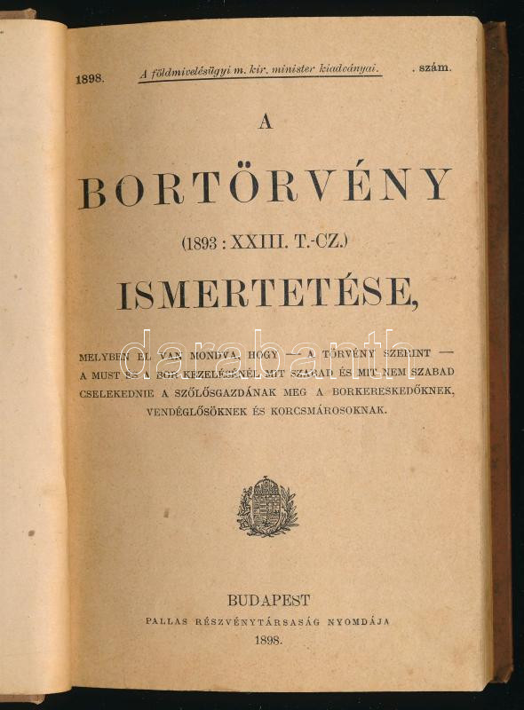 A bortörvény (1893: XXIII. t.-cz.) ismertetése, melyben el van mondva, hogy - a törvény szerint - a must és a bor kezelésénél mit szabad és mit nem szabad cselekednie a szőlősgazdának meg a borkereskedőknek, vendéglősöknek és korcsmárosoknak. Bp., 1898, Pallas-ny., 56. Hozzákötve: Csanády Gusztáv: Útmutatás a must és bor okszerű kezelésére kisebb szőlőbirtokosok számára, különös tekintettel az 1893: XXIII. t.-cz. végrehajtására. Bp., 1899, Pallas-ny., 176 p. Egészvászon-kötésben, ajándékozási bejegyzéssel, néhány kissé foltos lappal.