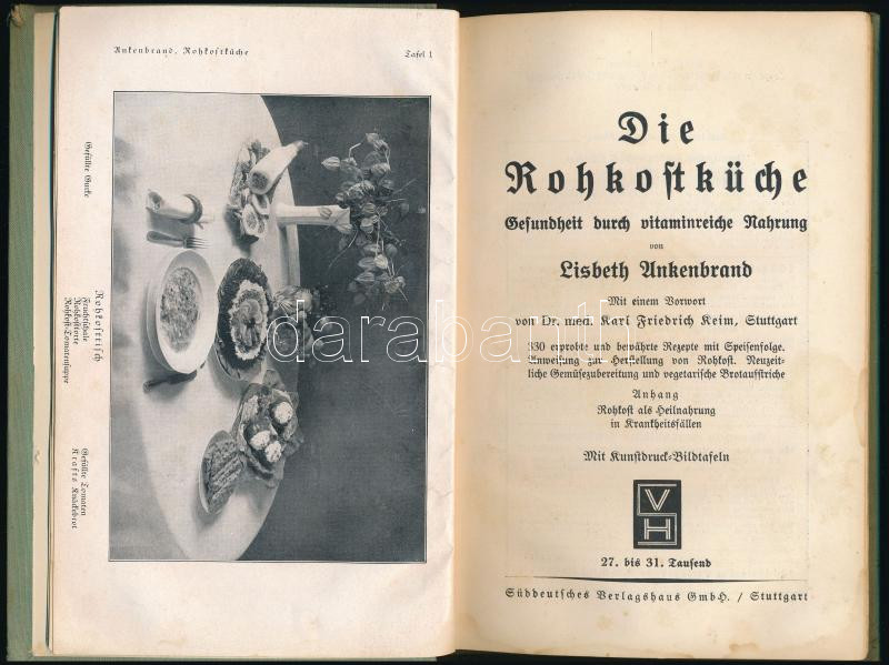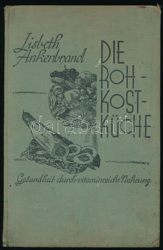 Leírás: Ankenbrand, Lisbeth: Die Rohkostküche. Gesundheit durch vitaminreiche Nahrung. Stuttgart, 1928, Süddeutsches Verlagshaus. Fekete-fehér képekkel illusztrálva. Német nyelven. Kiadói egészvászon-kötés, kissé foltos borítóval, kisebb lapszéli ázásnyomokkal, tulajdonosi bejegyzéssel.
