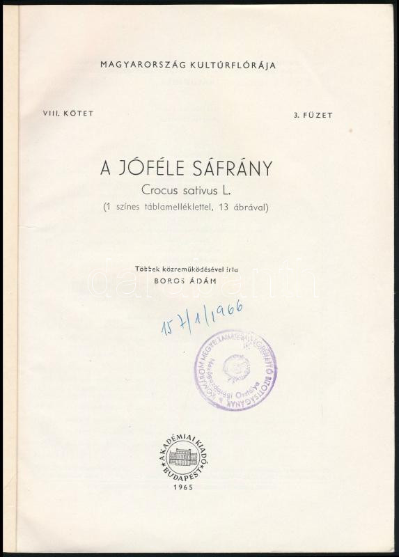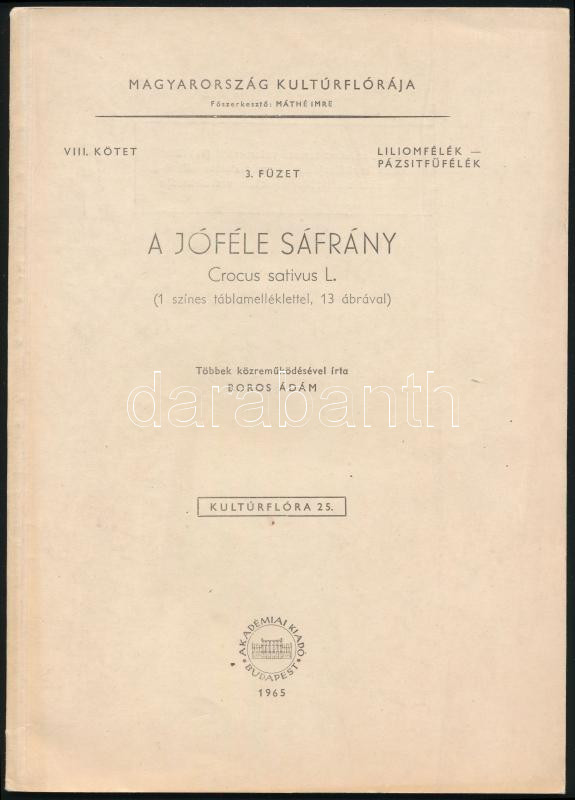 Boros Ádám et al.: A jóféle sáfrány. Crocus sativus L. Magyarország kultúrflórája. Liliomfélék - pázsitfűfélék VIII. köt. 3. füzet. Bp., 1965, Akadémiai Kiadó, 48 p.+ 1 t. Kiadói papírkötés.