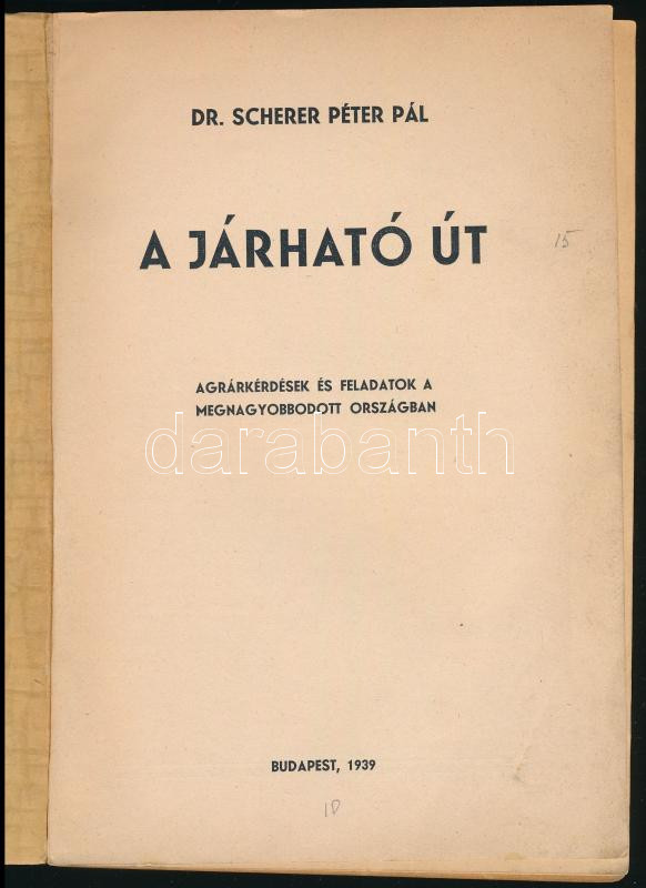 Dr. Scherer Péter Pál: A járható út. Agrárkérdések és feladatok a megnagyobbodott országban. Bp., 1939, Mérnökök Nyomdája. Kiadói papírkötés, kissé kopottas állapotban.