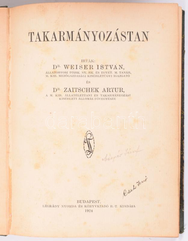 Dr. Weiser-Dr. Zaitschek: Takarmányozástan. Bp., 1924, Légrády. Félvás... https://www.darabanth.com/hu/514-Filatelia-kepeslap-numizmatika-mutargy-konyv-papirregiseg-ekszer-aukcio/515.0/Konyvek/Konyvek-Konyha-es-kert~620/Dr-Weiser-Dr-Zaitschek-Takarmanyozastan-Bp-1924-Legrady-Felvaszon-kotes-kopottas-a~II3477888