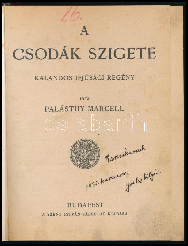 Palásthy Marcell: A csodák szigete. Kalandos ifjúsági regény. Bp., Szent István Társulat. Újrakötött műbőr kötés, ajándékozási sorokkal, kissé kopottas állapotban.