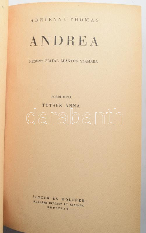 Thomas, Adrienne: Andrea. Regény fiatal leányok számára. Benedek Kata ... https://www.darabanth.com/hu/514-Filatelia-kepeslap-numizmatika-mutargy-konyv-papirregiseg-ekszer-aukcio/515.0/Konyvek/Konyvek-Mesekonyvek-ifjusagi-irodalom~631/Thomas-Adrienne-Andrea-Regeny-fiatal-leanyok-szamara-Benedek-Kata-rajzaival-Bp-Singer-es~II3481012