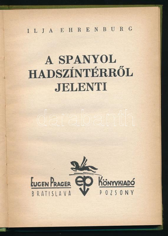 Ehrenburg, Ilja: A spanyol hadszíntérről jelenti. Pozsony, 1938, Eugen... https://www.darabanth.com/hu/514-Filatelia-kepeslap-numizmatika-mutargy-konyv-papirregiseg-ekszer-aukcio/515.0/Konyvek/Konyvek-Militaria-Katonasag~618/Ehrenburg-Ilja-A-spanyol-hadszinterrol-jelenti-Pozsony-1938-Eugen-Prager-Kiadoi-egeszvas~II3480483