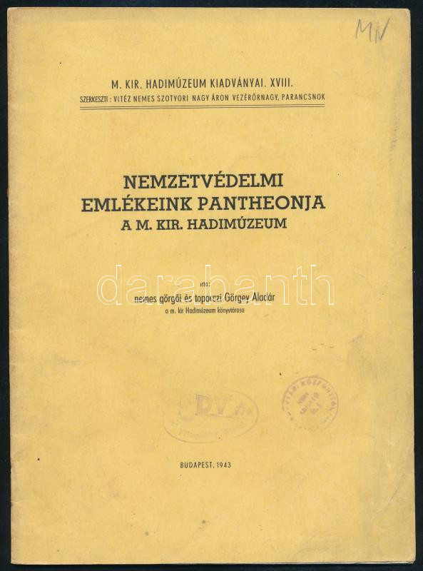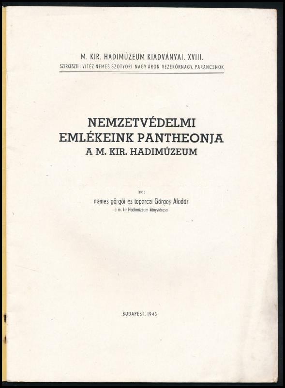 Görgey Aladár: Nemzetvédelmi emlékeink pantheonja, a M. Kir. Hadimúzeum. M. Kir. Hadimúzeum kiadványai. XVIII. Bp., 1943, (Juracsek-ny.), 30+(2) p. Fekete-fehér képekkel illusztrálva. Kiadói tűzött papírkötés, kissé koszos borítóval, intézményi bélyegzőkkel. Ritka!