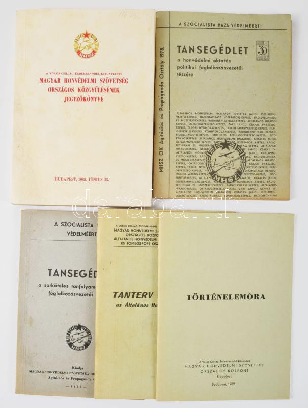 Magyar Honvédelmi Szövetség belső használatra készült kiadványai, 6 db: Tanterv és utasítás az Általános Honvédelmi Oktatáshoz.; Tansegédlet a sorköteles tanfolyamok politikai foglalkozásvezetői részére.; Katonapolitikai helyzet 1979. tavaszán.; A Vörös Csillag Érdemrenddel kitüntetett Magyar Honvédelmi Szövetség országos közgyűlésének jegyzőkönyve.; stb. Bp., 1975-1989, MHSZ. Kiadói papírkötés, vegyes állapotban.