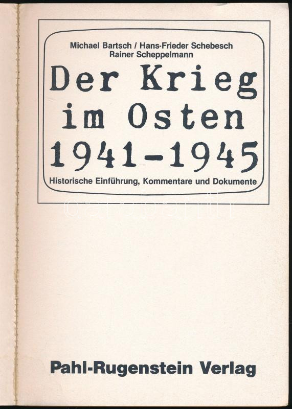 Michael Bartsch - Hans-Frieder Schebesch - Rainer Scheppelmann: De Krieg im Osten 1941-1945. Historische Einführung, Kommentare und Dokumente. H.n., 1981, Pahl-Rugenstein Verlag. Fekete-fehér képekkel illusztrálva. Német nyelven. Kiadói papírkötés, minimálisan sérült borítóval.