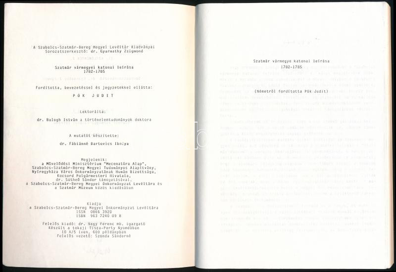 Leírás: Pók Judit: Szatmár vármegye katonai leírása 1782-1785. Nyíregyháza, 1993. Megjelent 600 példányban. Kiadói papírkötés, jó állapotban.