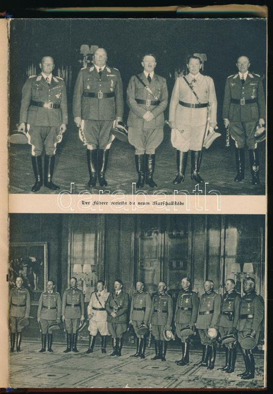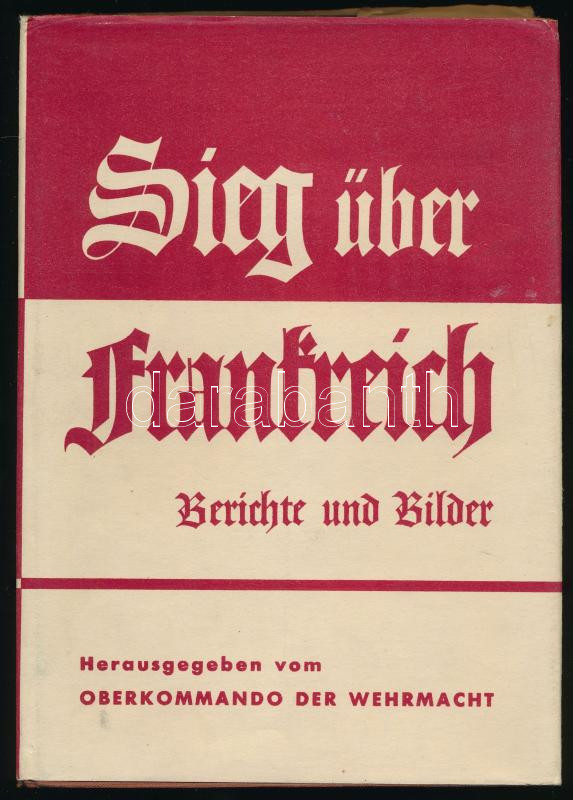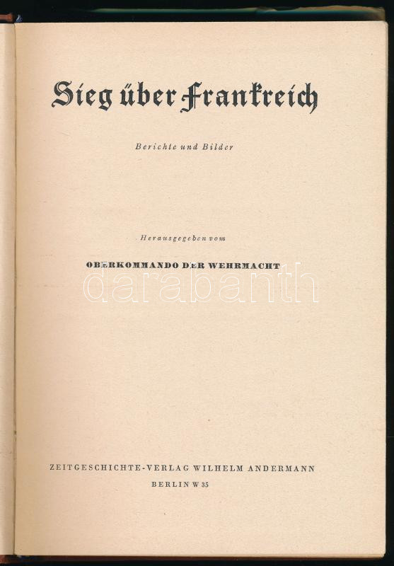 Sieg über Frankreich. Bericthe und Bilder. Herausgegeben vom Oberkommando der Wehrmacht. Berlin, 1940, Zeitgeschichte-Verlag Wilhelm Andermann. Fekete-fehér képekkel illusztrálva. Német nyelven. Kiadói egészvászon-kötés, kiadói papír védőborítóban.