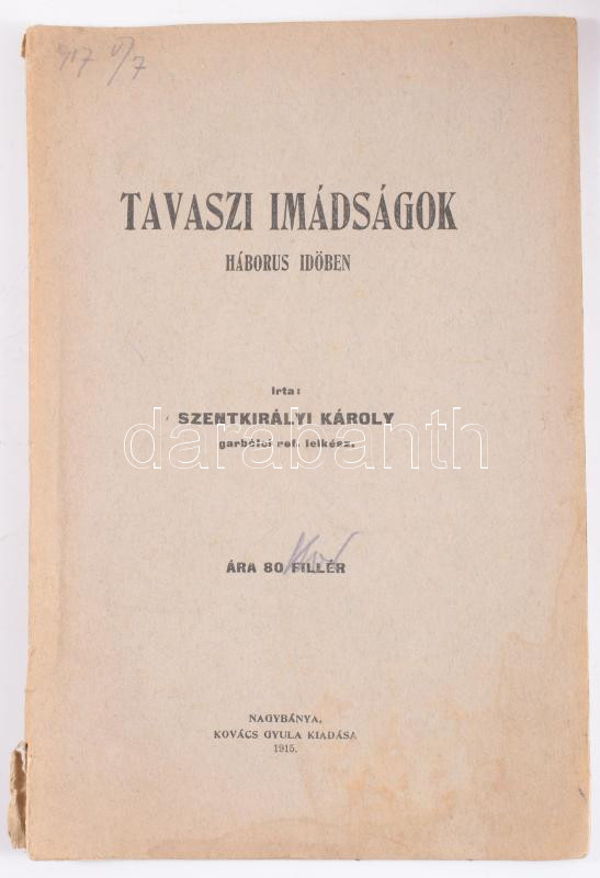 Szentkirályi Károly: Tavaszi imádságok háborús időkben. Nagybánya, 191... https://www.darabanth.com/hu/514-Filatelia-kepeslap-numizmatika-mutargy-konyv-papirregiseg-ekszer-aukcio/515.0/Konyvek/Konyvek-Militaria-Katonasag~618/Szentkiralyi-Karoly-Tavaszi-imadsagok-haborus-idokben-Nagybanya-1915-Kovacs-Gyula-31p~II3482189