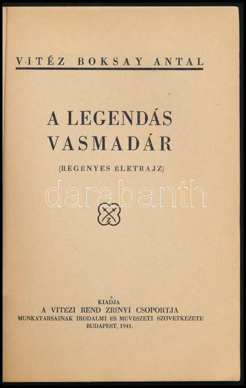 vitéz Boksay Antal: A legendás vasmadár. [Ittebei Kiss József (1896-1918) I. világháborús vadászpilóta életrajza.] Bp., 1941, Vitézi Rend Zrínyi Csoportja, 68 p.+ 4 (fekete-fehér képek) t. Első kiadás. A borító vitéz Pataky Ferenc festőművész munkája. Kiadói papírkötés.