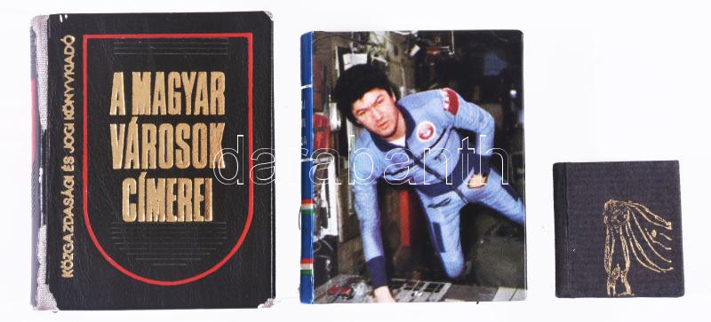 Leírás: 3 darab minikönyv, közte Magyar városok címerei, kopással.