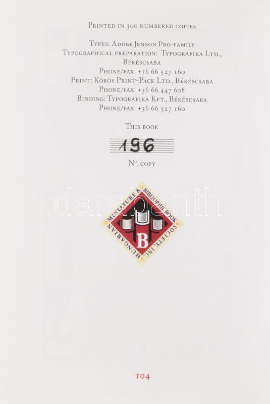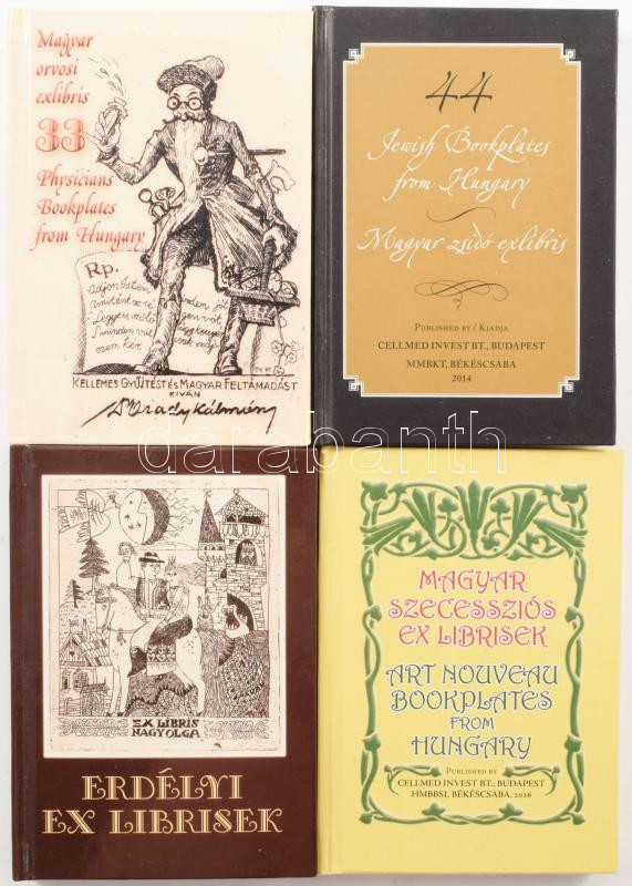 4 db ex libris témájú minikönyv (számozott példányok): Erdélyi ex librisek. (2./300); 33 Magyar orvosi exlibris. / 33 Physicians Bookplates from Hungary. (31./200); Magyar szecessziós ex librisek. / Art Nouveau Bookplates from Hungary. (196./300); 44 Jewish Bookplates from Hungary. / 44 Magyar zsidó exlibris. (77./200). Bp.-Békéscsaba, 2014-2017, Cellmed Invest Bt. - MMBKT/HMBBSI. Kiadói kartonált papírkötés.