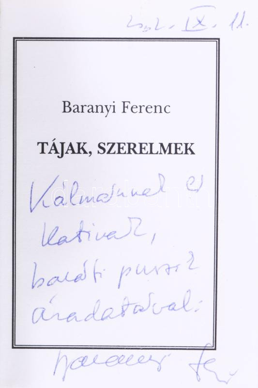 Baranyi, Ferenc: Tájak, szerelmek. DEDIKÁLT! Bp., 2002, Szerzői. Számo... https://www.darabanth.com/hu/514-Filatelia-kepeslap-numizmatika-mutargy-konyv-papirregiseg-ekszer-aukcio/515.0/Konyvek/Konyvek-Minikonyvek~630/Baranyi-Ferenc-Tajak-szerelmek-DEDIKALT-Bp-2002-Szerzoi-Szamozott-042100-peldany~II3477705