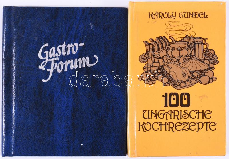 Leírás: Gastro-Forum. Szerk.: Csizmadia, László. [Bp],1985.,Pannonia. Német nyelvű minikönyv, receptekkel. Kiadói műbőr-kötés. + Gundel, Károly: 100 ungarische Kochrezepte. Bp., 1985, Corvina. Kiadói kartonált kötés, jó állapotban.