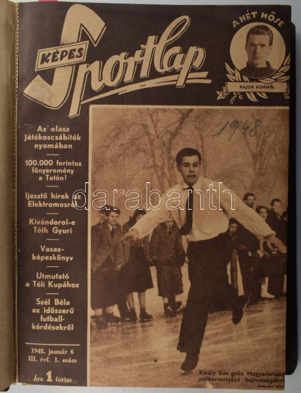 1948 Képes Sportlap III. évf. 1-41. sz., 1948. jan. 6. - szept. 28. (nem teljes évfolyam), benne érdekes hírekkel és képekkel (Puskás Ferenc, Hidegkuti Nándor, Szusza Ferenc és mások). Félvászon-kötésben.