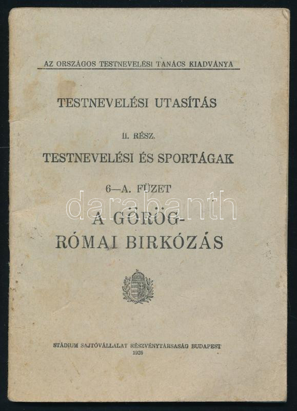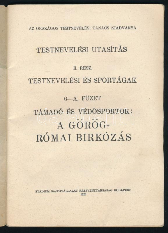 Testnevelési utasítás II. rész. Testnevelési és sportágak 6-A. füzet. Támadó és védősportok: A görög-római birkózás. Az Országos Testnevelési Tanács kiadványa. Bp., 1926, Stádium-ny., 65+(3) p. Kiadói tűzött papírkötés, kissé foltos borítóval.