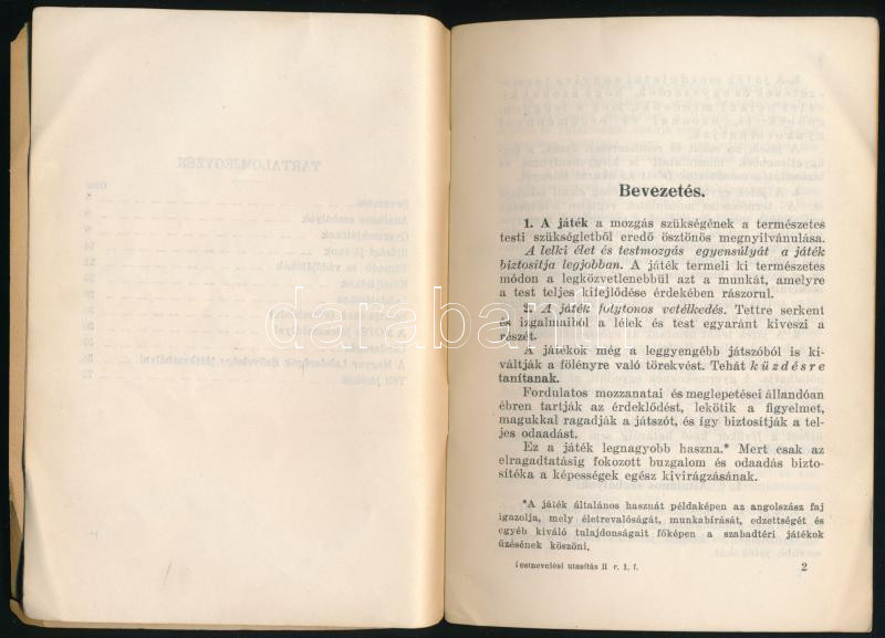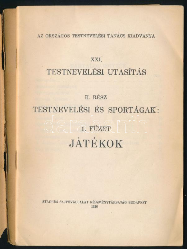 XXI. Testnevelési utasítás. II. rész. Testnevelési és sportágak. 1. füzet: Játékok. Bp., 1926, Országos Testnevelési Tanács (Stádium-ny.), 72 p. Kiadói tűzött papírkötés, sérült, a tűzéstől különvált borítóval, belül a lapok nagyrészt jó állapotban.