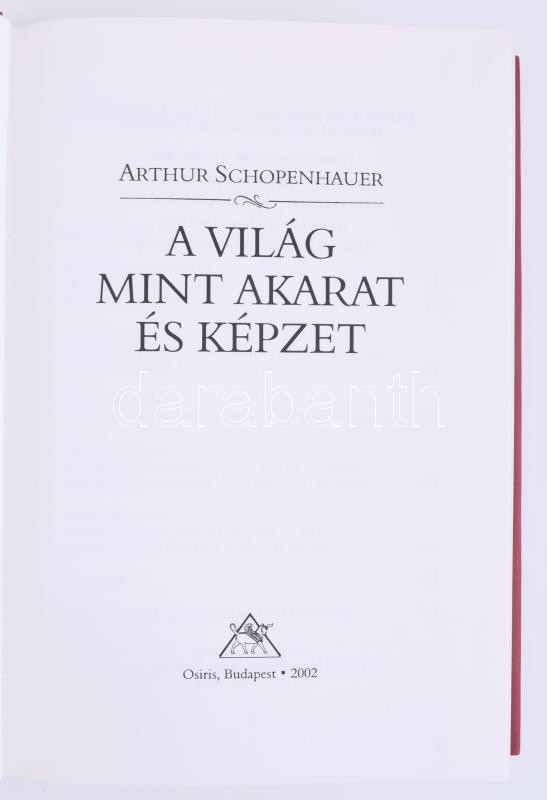 Arthur Schopnhauer: A világ mint akarat és képzet. Sapientia Humana. B... https://www.darabanth.com/hu/514-Filatelia-kepeslap-numizmatika-mutargy-konyv-papirregiseg-ekszer-aukcio/515.0/Konyvek/Konyvek-Tarsadalomtudomany~624/Arthur-Schopnhauer-A-vilag-mint-akarat-es-kepzet-Sapientia-Humana-Bp-2002-Osiris-Kiadoi-~II3463633