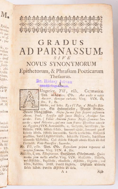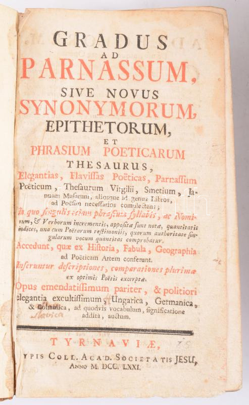 Gradus ad parnassum, sive novus synonimorum, epithetorum et phrasium poeticarum thesaurus, Elegantias, Flavissas Poeticas, Parnassum... Accedunt, quae ex Historia, Fabula, Geographia ad Poeticam Artem conferunt. Inseruntur descriptiones, comparationes plurima ex optimis Poetis excerptae. Opus emendatissimum pariter, & politiori elegantia excultissimum, Ungarica, Germanica, & Bohemica, ad quodvis vocabulum, significatione addíta, auctum.