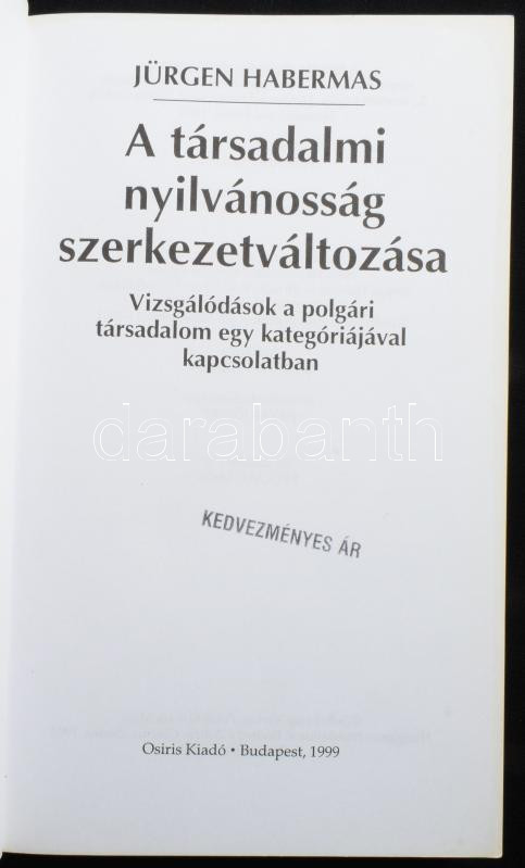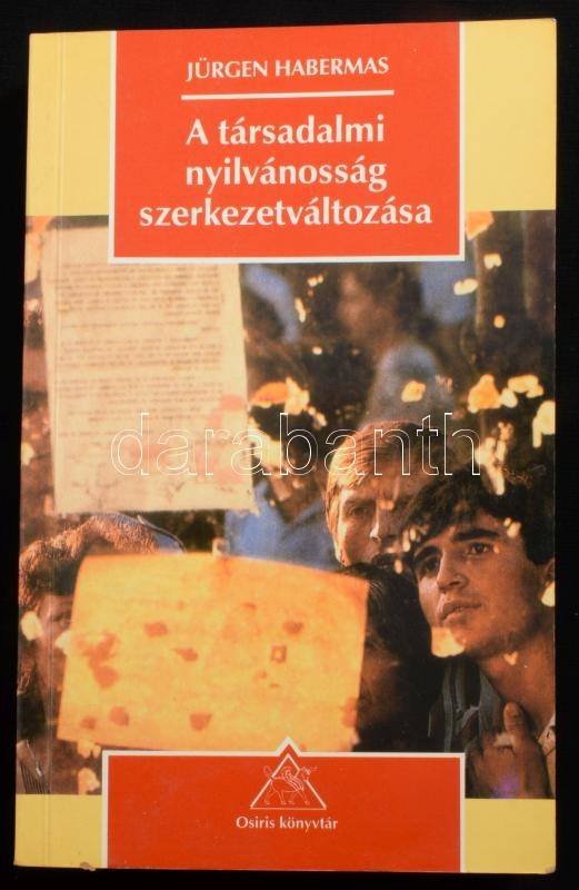 Jürgen Habermas: A társadalmi nyilvánosság szerkezetváltozása. Vizsgálódások a polgári társadalom egy kategóriájával kapcsolatban. Ford.: Endreffy Zoltán, Galvina Zsuzsa. Felkai Gábor utószavával. Osiris Könyvtár. Bp., 1999, Osiris, 395+3 p. Kiadói papírkötés.